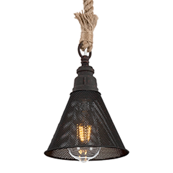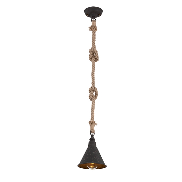Maritime pendant with rope suspension and lacquered metal shade in rust and black.